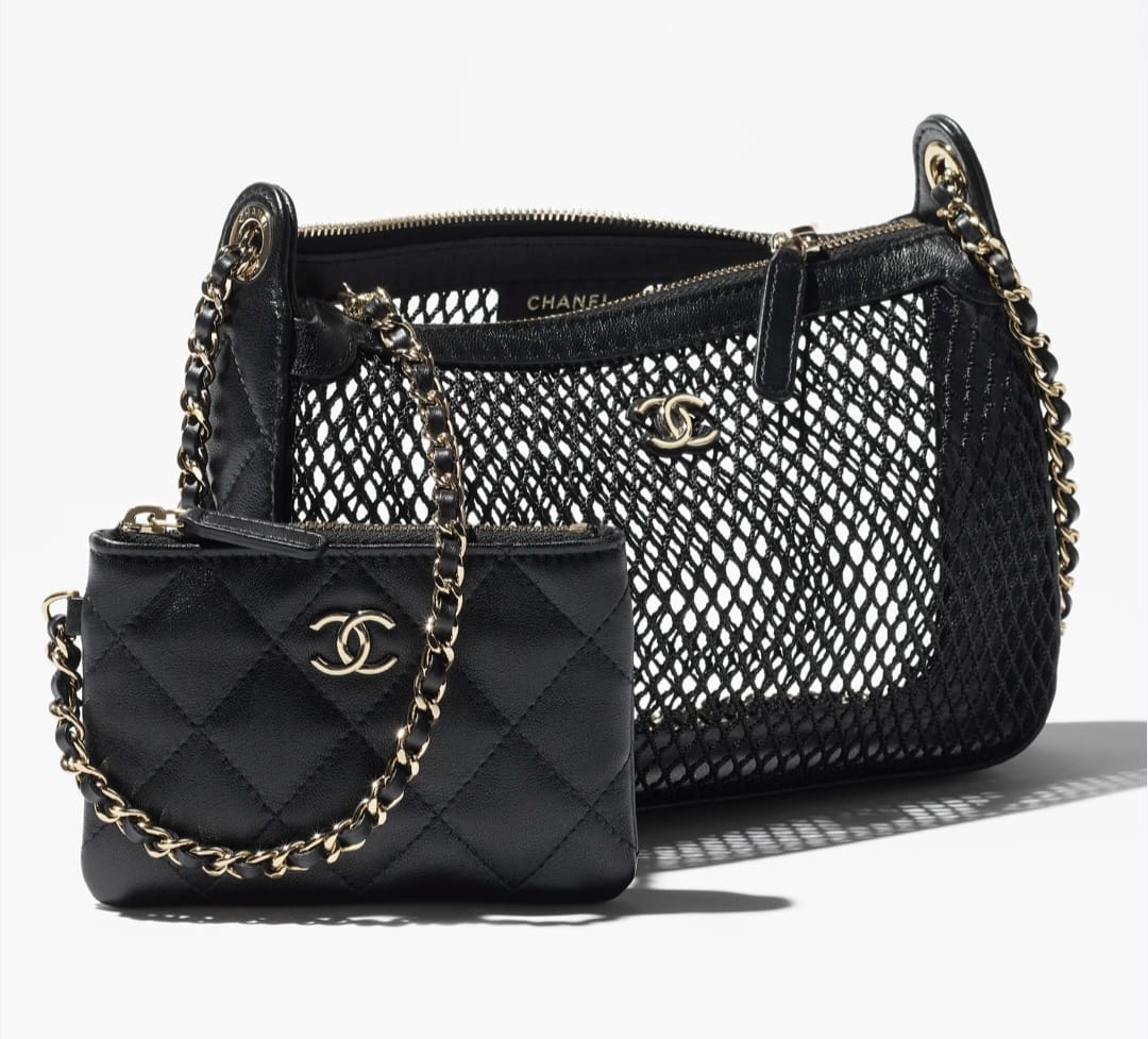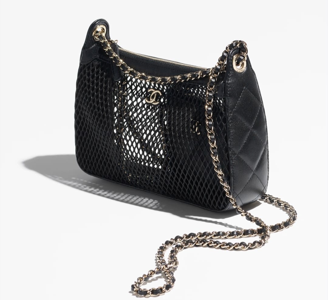 التصميم: شكل نصف القمر بتفاصيل معدنية تحمل شعار CHANEL