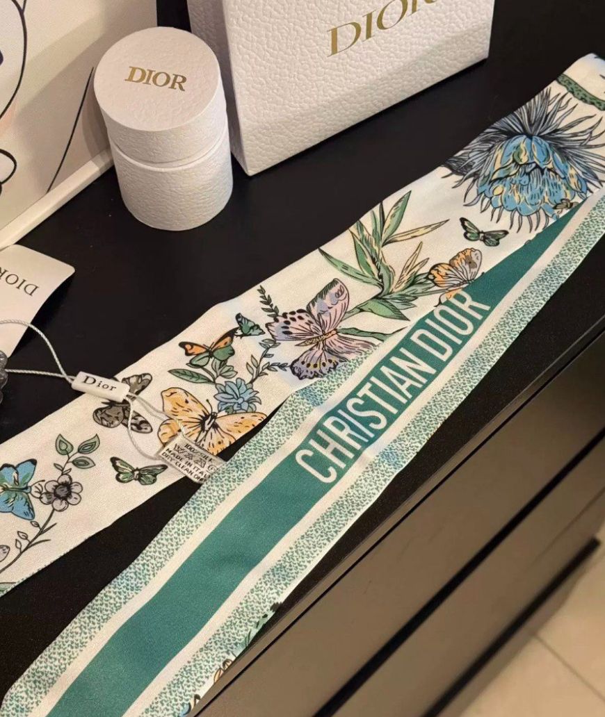 وشاح Mitzah فاخر من Dior مصنوع من حرير التويل عالي الجودة، يتميز بطبعة أنيقة متعددة الألوان تجمع بين الفراشات وزهور السوسن بأسلوب فني راقٍ يعكس هوية ديور الكلاسيكية.