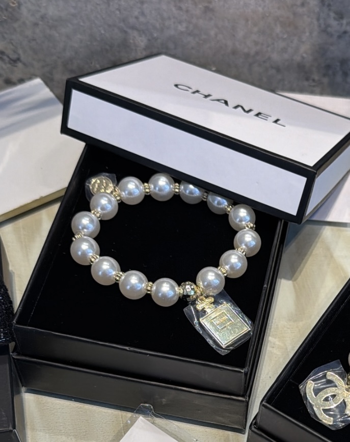 أساور مستوحاة من تصاميم Chanel، مزينة بحبات اللؤلؤ الصناعي وتعليقات على شكل قنينة العطر الشهيرة. تأتي كل قطعة مع البكس الأسود الخاص بها، لتكون إضافة فاخرة لمجموعتك أو كهدية مميزة. تضيف هذه الأساور لمسة أنيقة وإبداعية لإطلالتك اليومية أو لمناسباتك الخاصة.