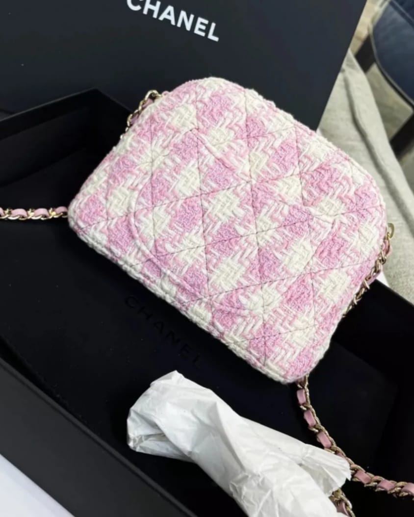 حقيبة شانيل فاخرة وحصرية لعملاء VIP، بتصميم أنيق من التويد الوردي الراقي ولمسة مميزة مع سلسلة معدنية مطلية بلمسة 24K تضيف فخامة استثنائية. تصميم “Shell” العصري يجعلها قطعة لافتة تناسب الإطلالات الراقية والمناسبات الخاصة، وتُعد إضافة نادرة لهواة اقتناء إصدارات شانيل الحصرية.