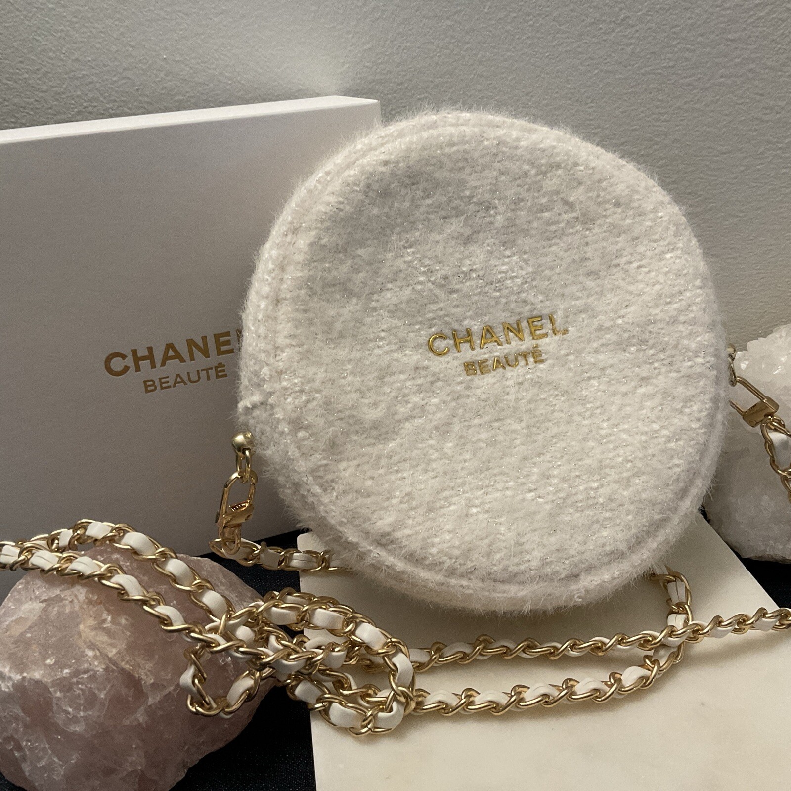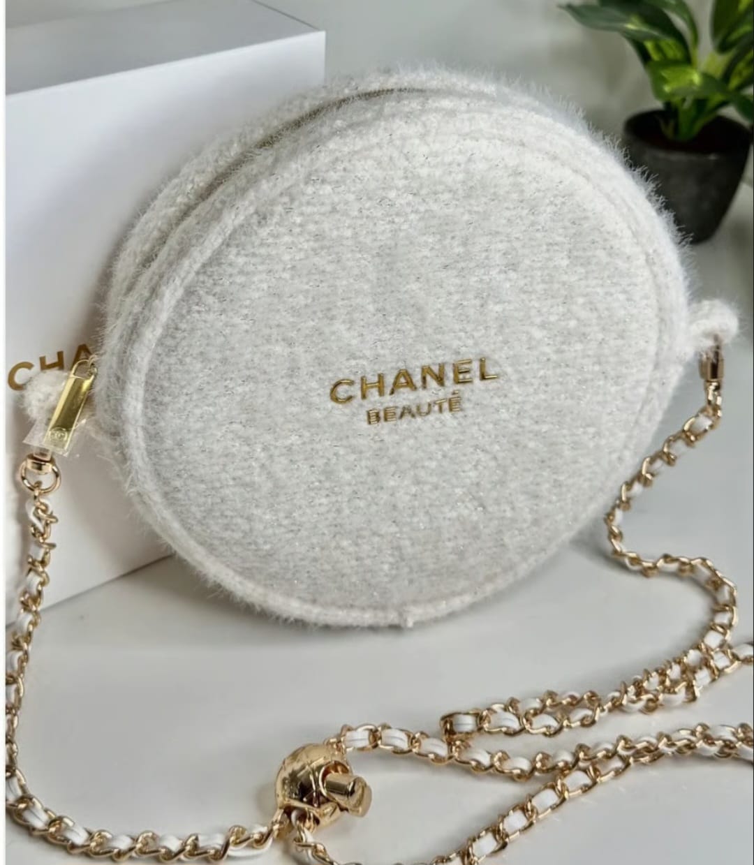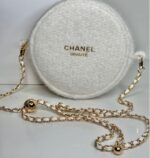 Chanel Beauté White Wool Round Cosmetic Bag – With Chain