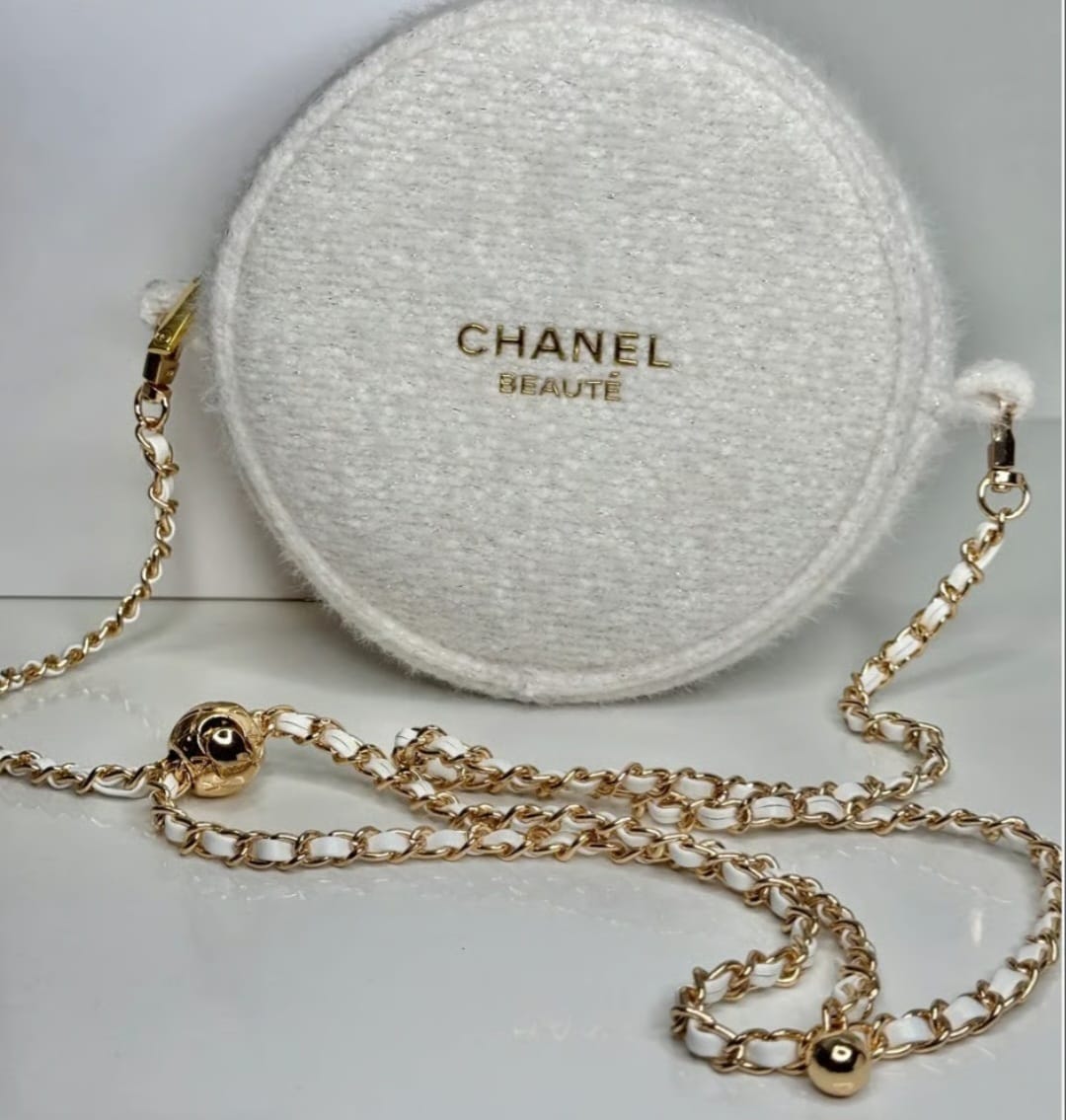 حقيبة مكياج فاخرة من Chanel Beauté بتصميم دائري أنيق مصنوع من صوف أبيض ناعم يمنحها طابعًا راقيًا ومميزًا. تأتي مزودة بسلسلة معدنية أنيقة تتيح حملها كحقيبة صغيرة أو استخدامها كقطعة إكسسوار فاخرة.
