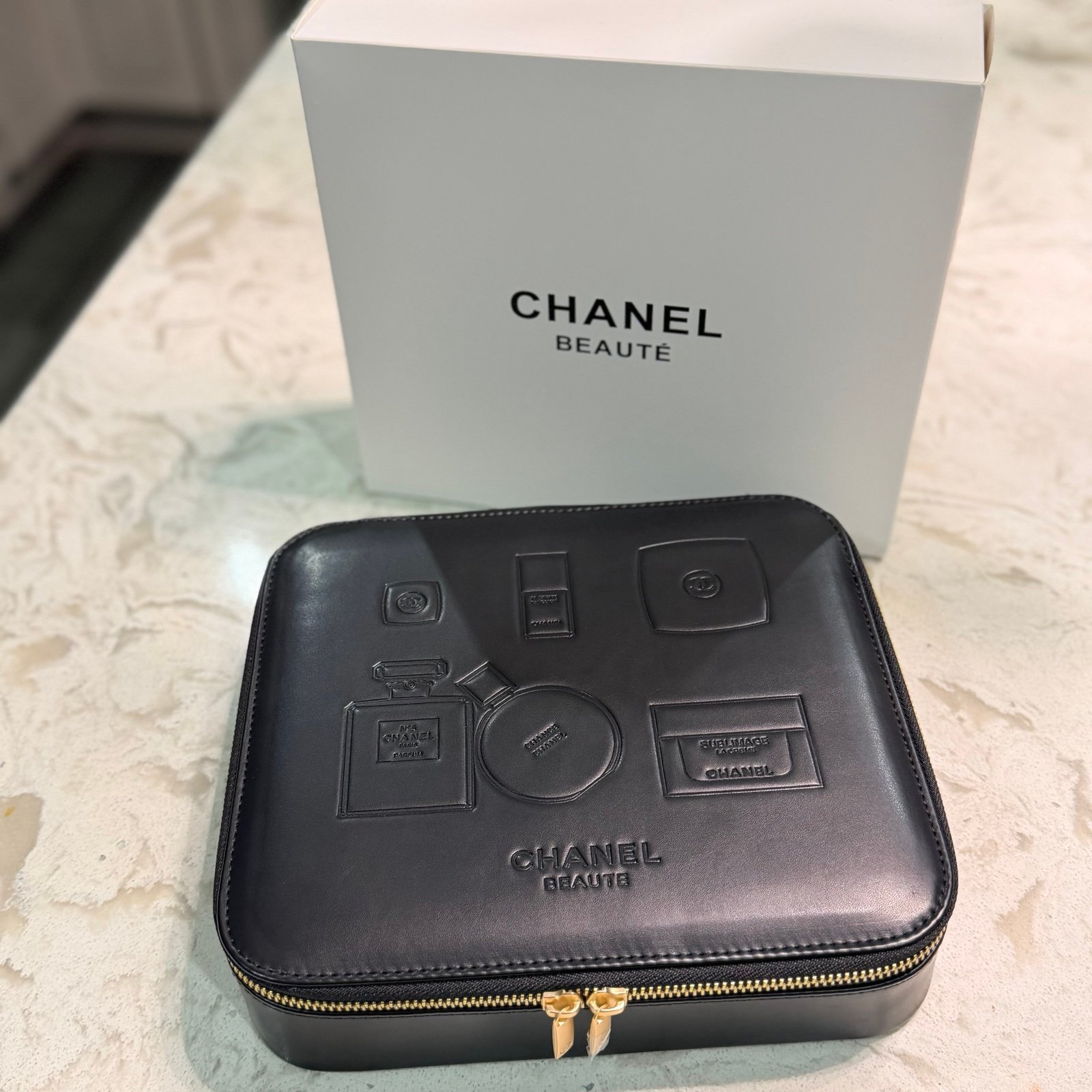 Chanel Large Black Cosmetic Bag – Embossed Beauty Design (25cm × 25cm)