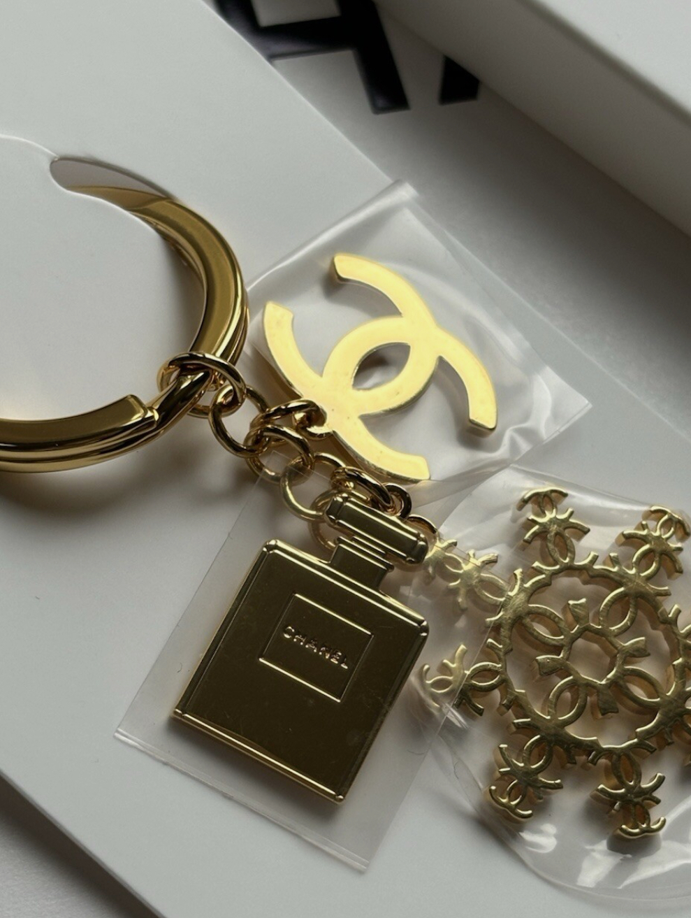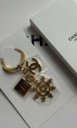 سلسلة مفاتيح فاخرة من Chanel بتصميم محدود وراقي، مصنوعة باللون الذهبي. تتميز بحليات متدلية أنيقة تشمل شعار “CC” الكلاسيكي، زجاجة عطر، وندفة ثلج، لتضيف لمسة فاخرة وعصرية لمفاتيحك أو حقيبتك.