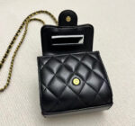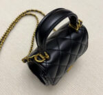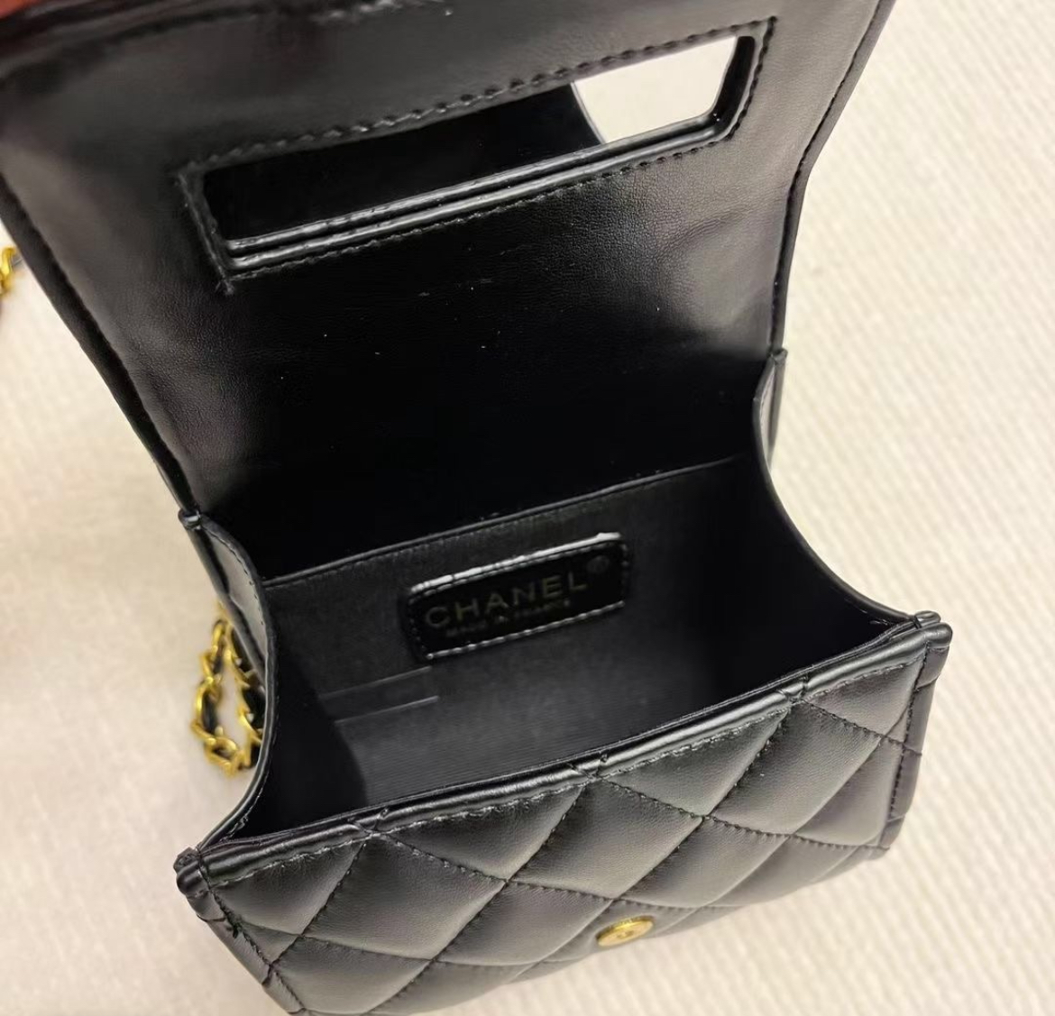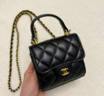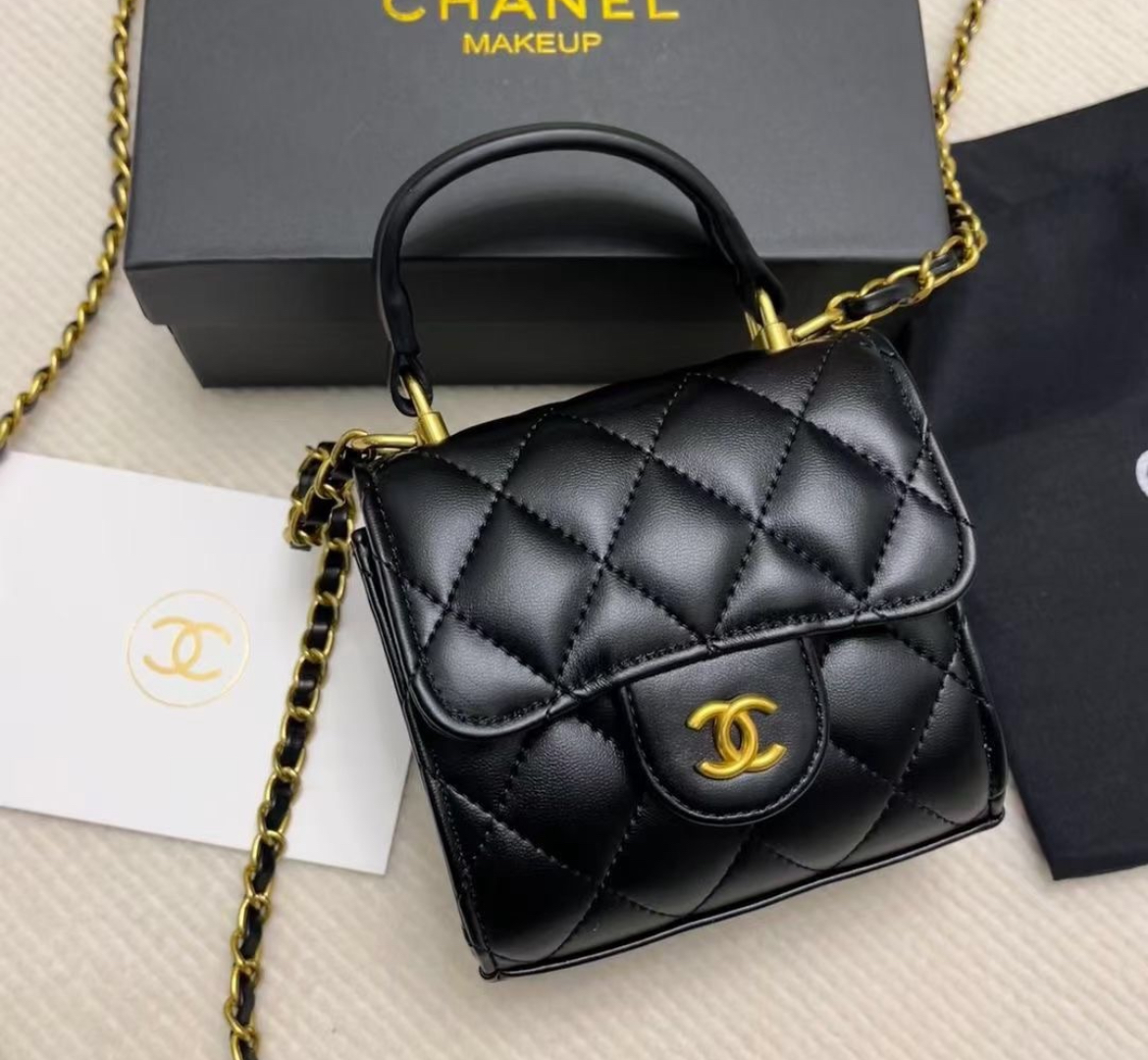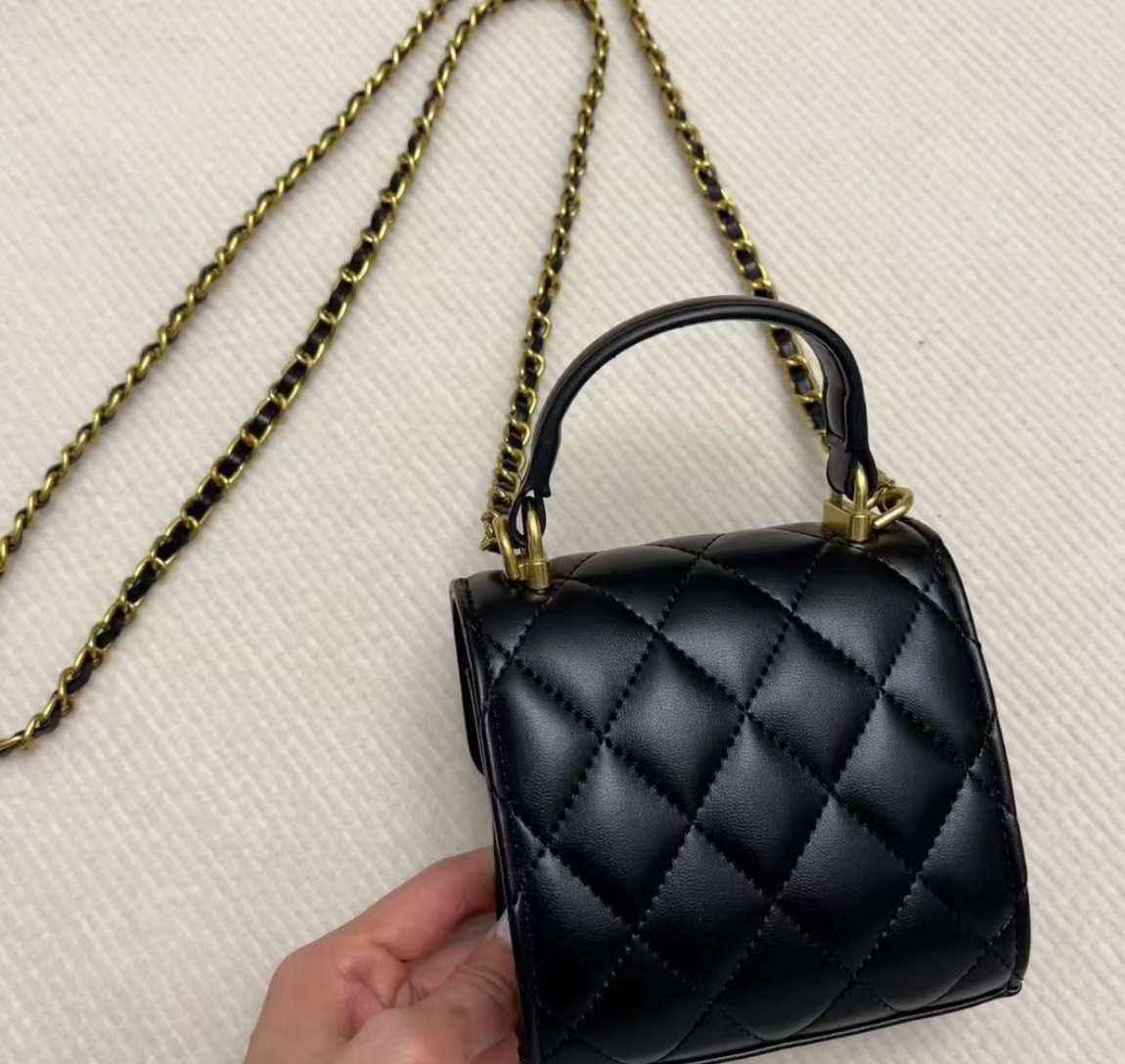 حقيبة شانيل الصغيرة بمقبض علوي من دار الأزياء الفرنسية العريقة Chanel، تتميز بتصميمها الكلاسيكي المبطن بنقشة المعين الأيقونية التي تعكس فخامة وأناقة العلامة. تأتي باللون الأسود الأنيق مع تفاصيل معدنية ذهبية تضيف لمسة راقية ولافتة.