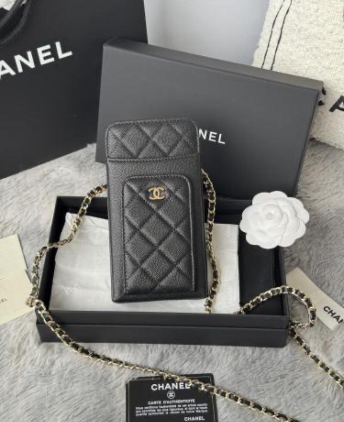 هذه حقيبة هاتف أنيقة من شانيل، مصنوعة من جلد الكافيار الفاخر المبطن الذي يضمن المتانة والفخامة في الوقت ذاته. تأتي مزودة بسلسلة معدنية أنيقة لتسهيل حملها على الكتف، مما يجعلها خيارًا عمليًا وأنيقًا لمختلف المناسبات اليومية والخاصة.