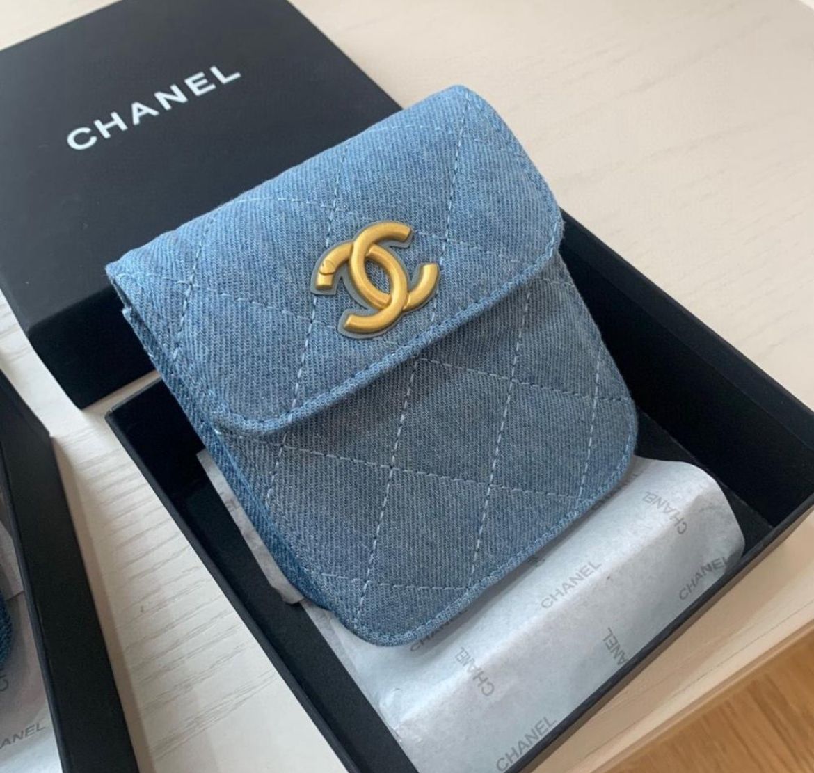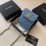حقيبة صغيرة أنيقة من ماركة شانيل، مصنوعة من قماش الجينز الأزرق عالي الجودة. تتميز الحقيبة بسلسلة ذهبية فاخرة وشعار شانيل المميز، ما يمنحها لمسة كلاسيكية وعصرية في الوقت ذاته. تصميمها المدمج يجعلها مثالية للاستخدام اليومي والمناسبات الخاصة.