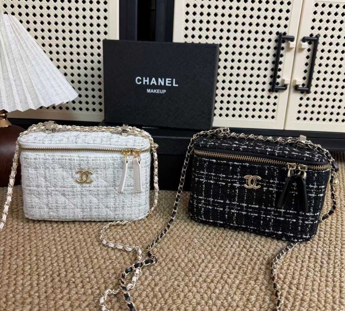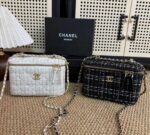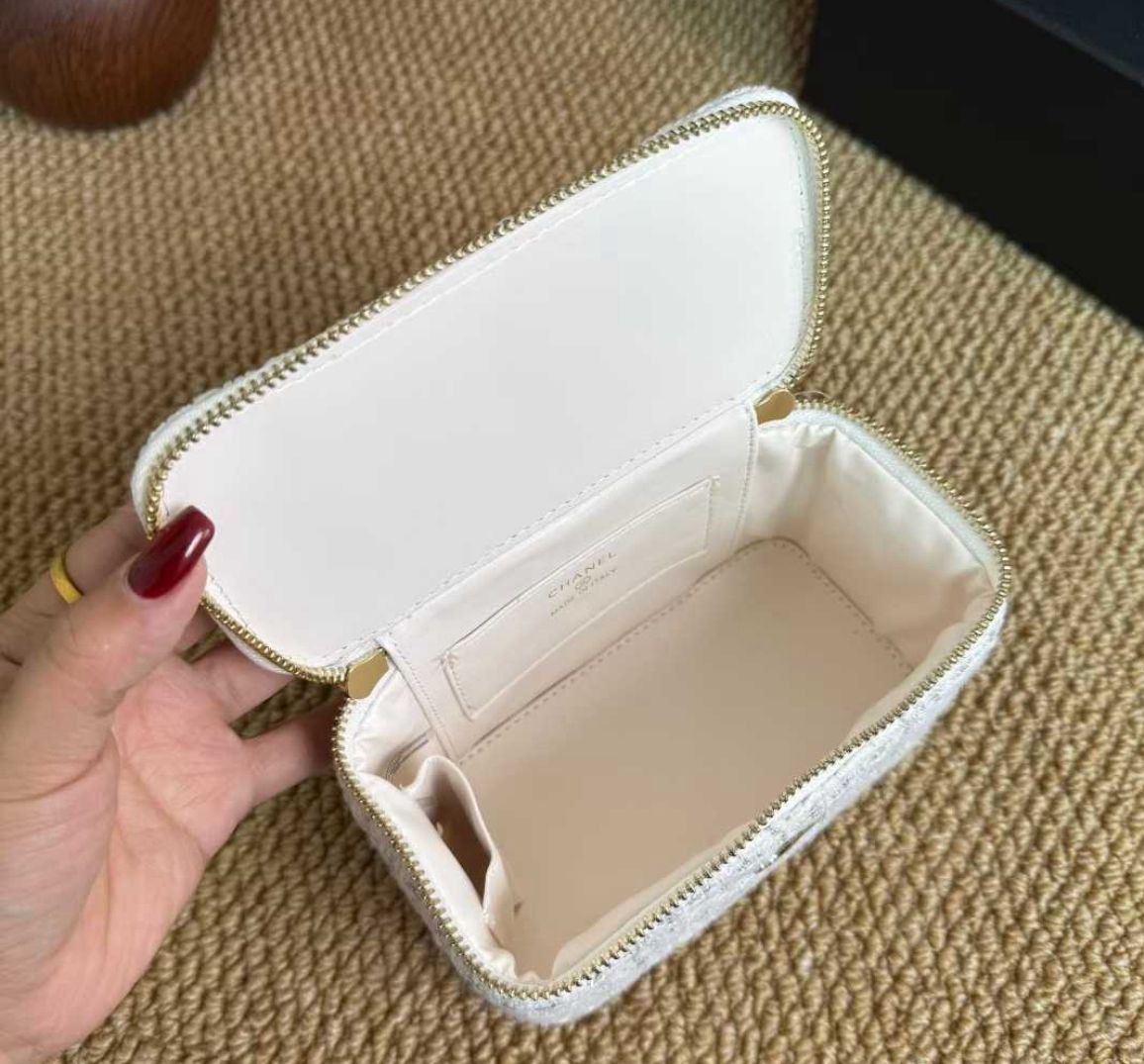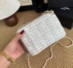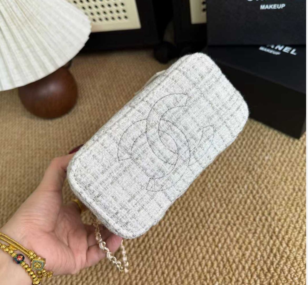 حقيبة صغيرة فاخرة من شانيل مصنوعة من قماش التويد الأيقوني باللون الأبيض الأنيق، لتعكس مزيجًا مثاليًا بين الرقي الكلاسيكي واللمسة العصرية الراقية. تتميز بتصميم أنثوي ناعم يناسب مختلف الإطلالات، سواء اليومية أو المناسبات الخاصة.