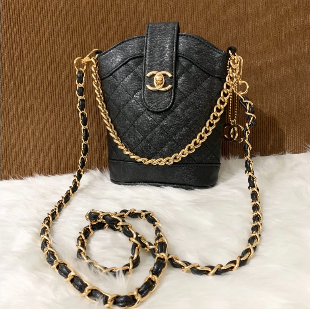 حقيبة دلو نسائية أنيقة من Chanel باللون الأسود الكلاسيكي، مصنوعة من جلد مبطن فخم وتتميز بسلسلة ذهبية متشابكة ولمسة حروف CC ذهبية الأيقونية، ما يجعلها رمزًا للفخامة والأناقة الراقية.