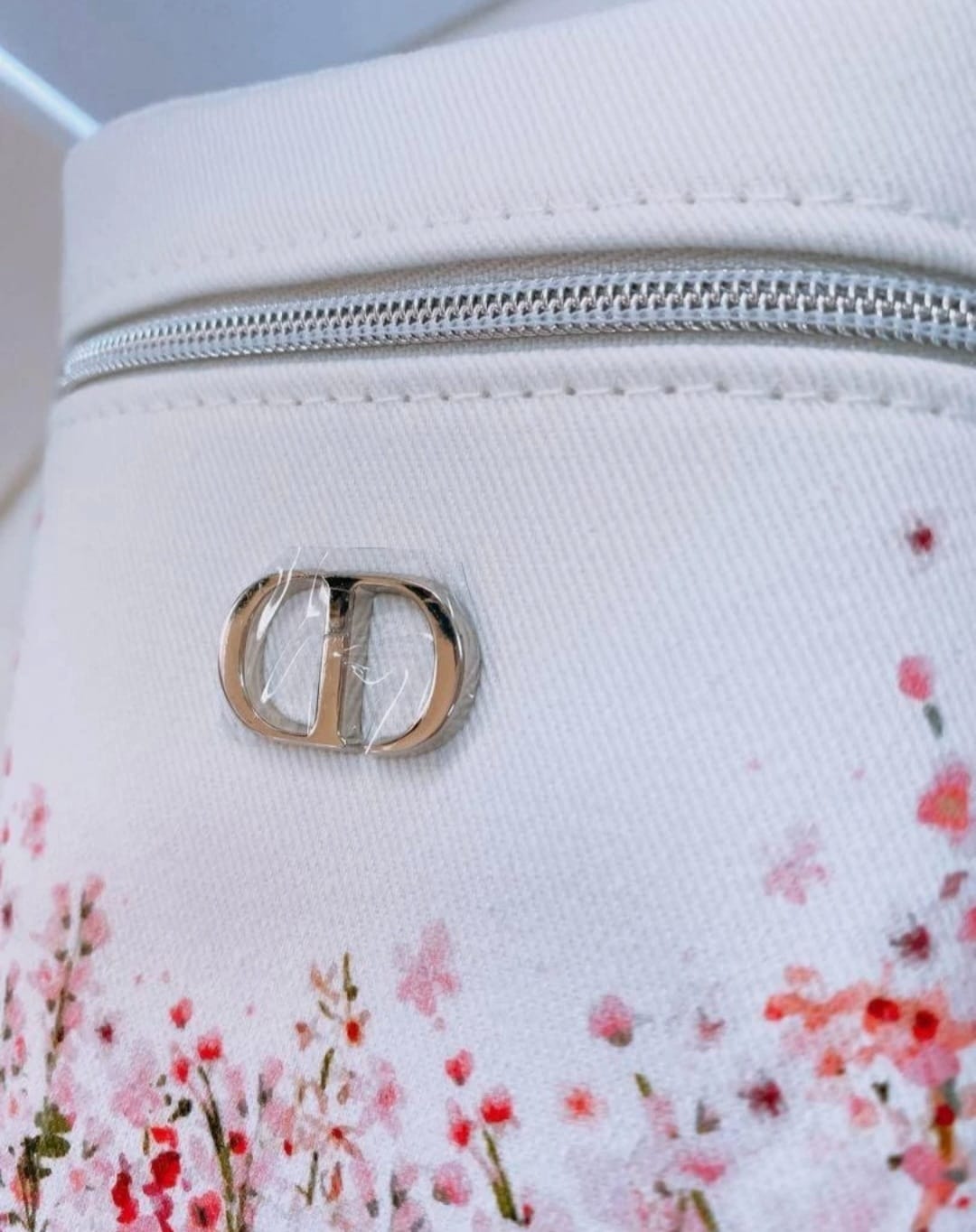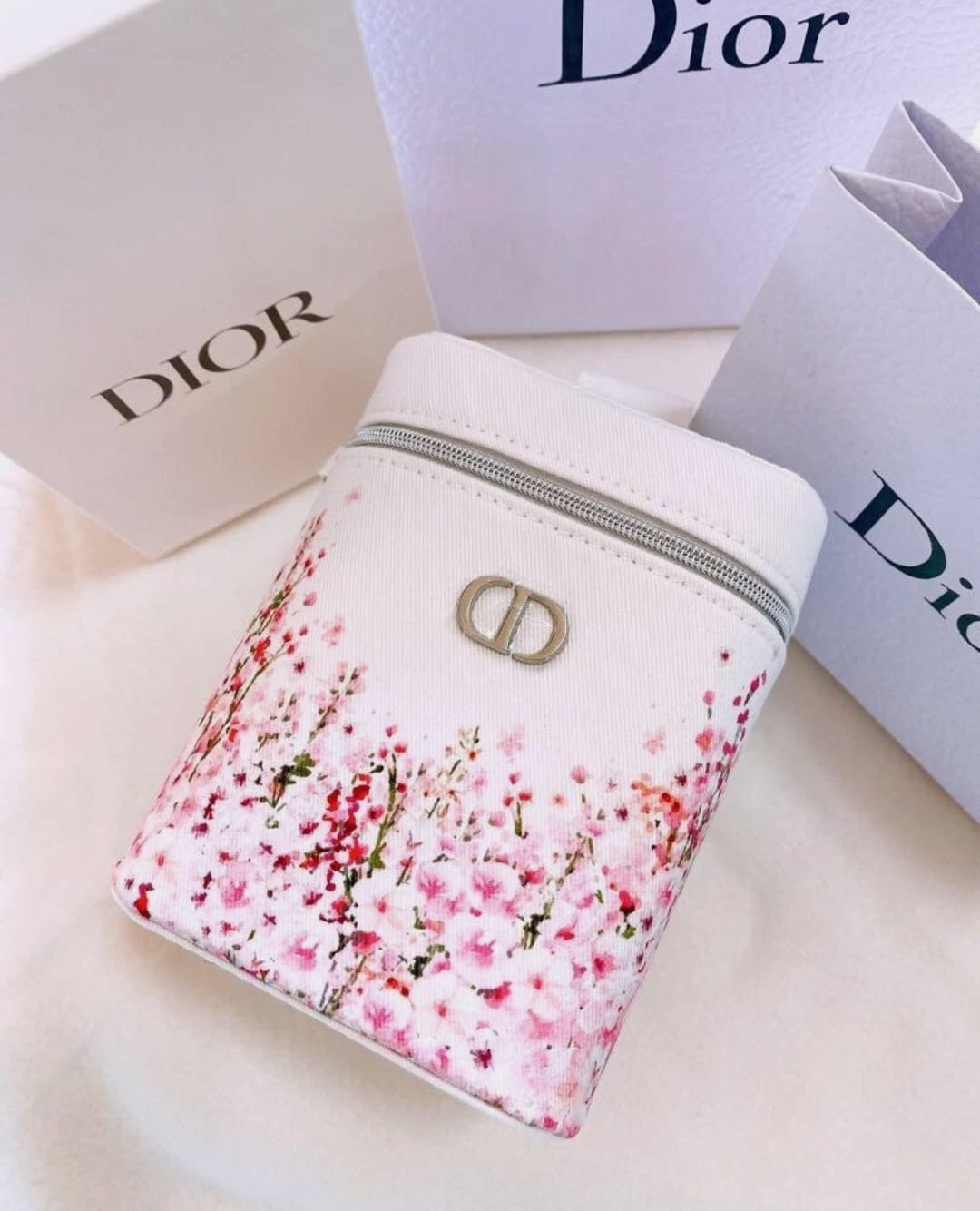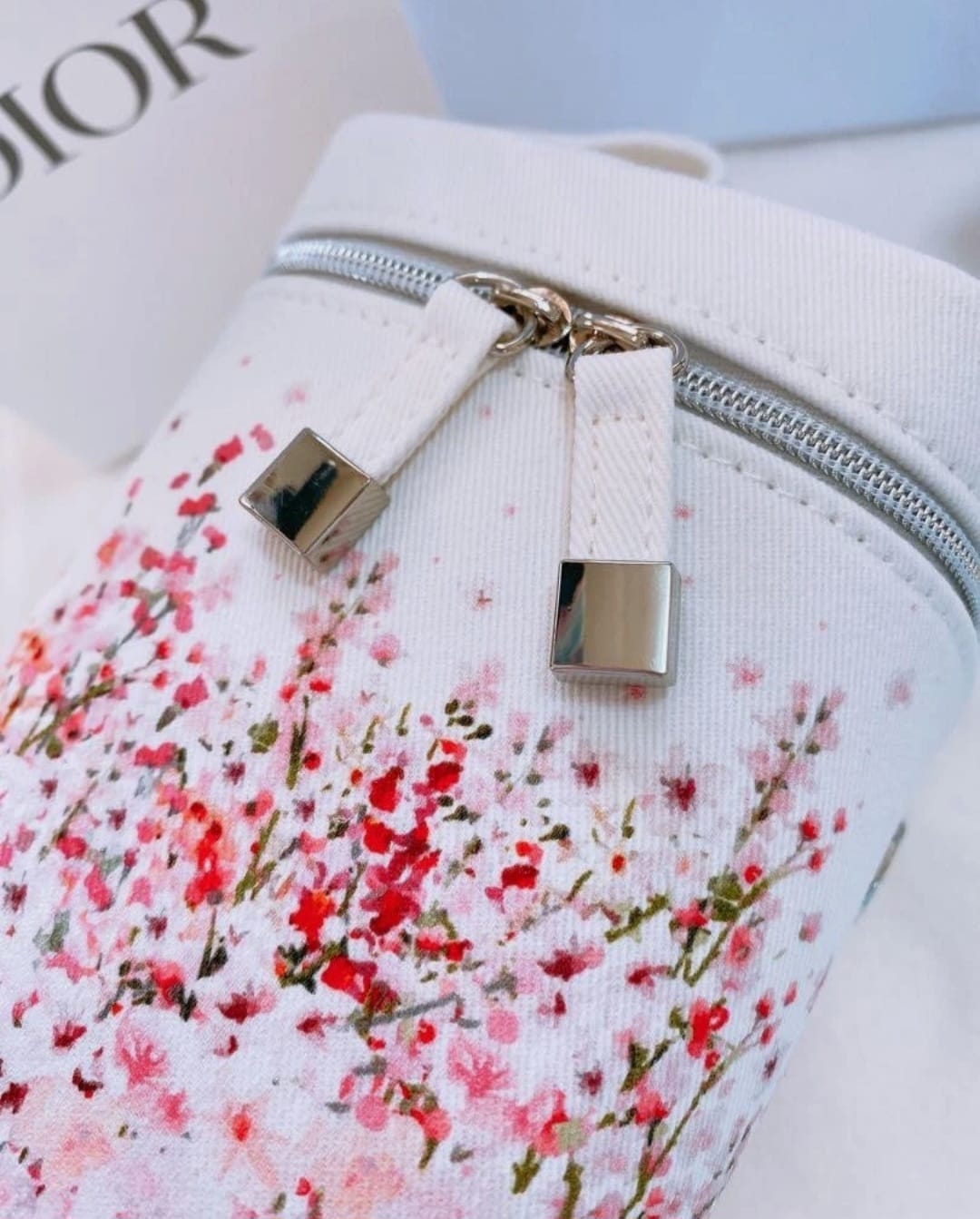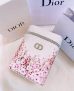 حقيبة فانيتي أنيقة من Christian Dior بتصميم زهري أبيض راقٍ، إصدار محدود وجديد مخصص للسوق الياباني. تجمع بين الفخامة والعملية، ومثالية لتنظيم مستحضرات التجميل أو الإكسسوارات الصغيرة بأسلوب ديور المميز.