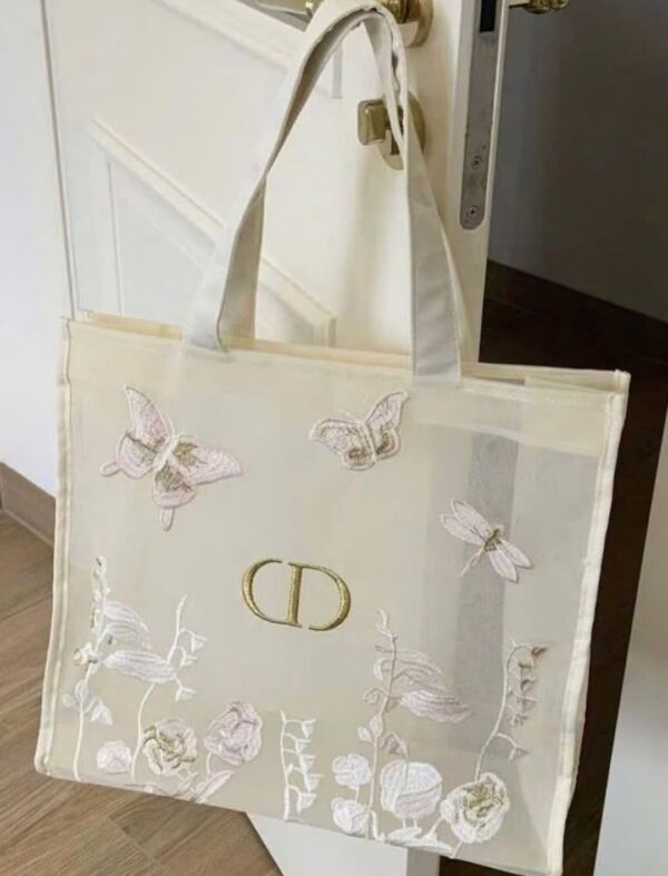 حقيبة يد أنيقة من Dior بتصميم شفاف يجمع بين الرقي والأنوثة. تتميز بتطريزات ناعمة على شكل فراشات وزهور دقيقة تضيف لمسة فنية راقية، مع شعار CD الذهبي في المنتصف ليمنحها طابعًا فاخرًا. مصنوعة من خامات خفيفة وعالية الجودة، مما يجعلها مثالية للاستخدام اليومي أو المناسبات الخاصة، وتضفي لمسة من الأناقة العصرية على أي إطلالة.