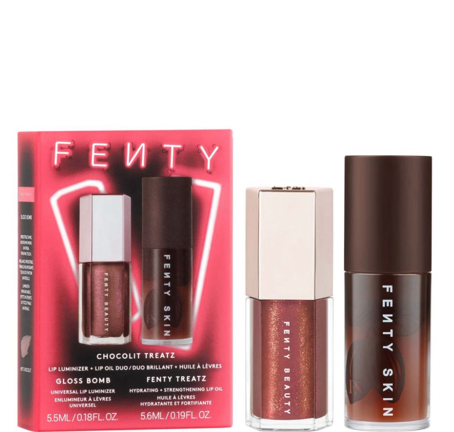 هو مجموعة شفاه من Fenty Skin تشمل زيت شفاه مرطب وGloss Bomb صغير بعبير الكاكاو ولون غني مستوحى من الشوكولاتة. تحتوي المجموعة على Fenty Treatz Lip Oil بخلاصة الكاكاو التي تساعد على ترطيب الشفاه وتنعيمها، وMini Gloss Bomb Lip Luminizer بدرجة Hot Chocolit لمنح الشفاه لمعان لامع ولمسة لون جذّابة. هذا المنتج يُقدَّم عادة كإصدار محدود أو مجموعة خاصة تعزز الترطيب والبريق مع لمسة عطرية مميزة.