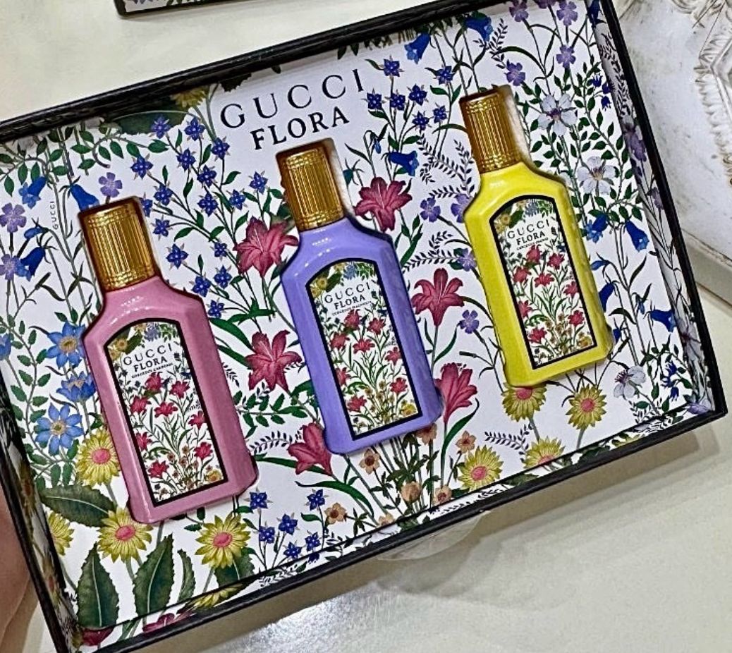 - 3 عطور من Gucci Flora Gorgeous Gardenia بأحجام عملية مثالية للاستخدام الشخصي أو كهدية أنيقة.