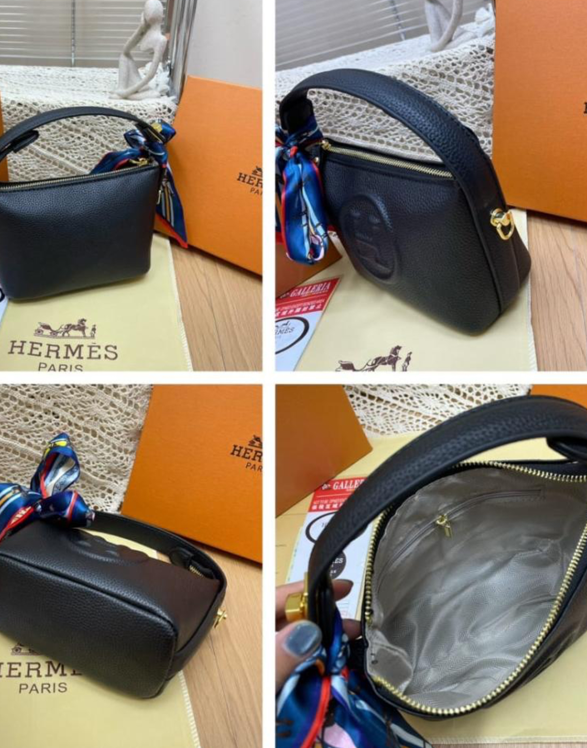 حقيبة يد من هيرميز بتصميم أنيق يعكس هوية العلامة الفاخرة، تأتي باللون الأسود الكلاسيكي الذي يمنحها طابعاً راقياً وسهولة في التنسيق مع مختلف الإطلالات. تتميز الحقيبة بتفاصيل دقيقة وتشطيب عالي الجودة، مع سكارف أنيق يضيف لمسة مميزة ويمكن تنسيقه بطرق مختلفة على المقبض لإطلالة أكثر فخامة.