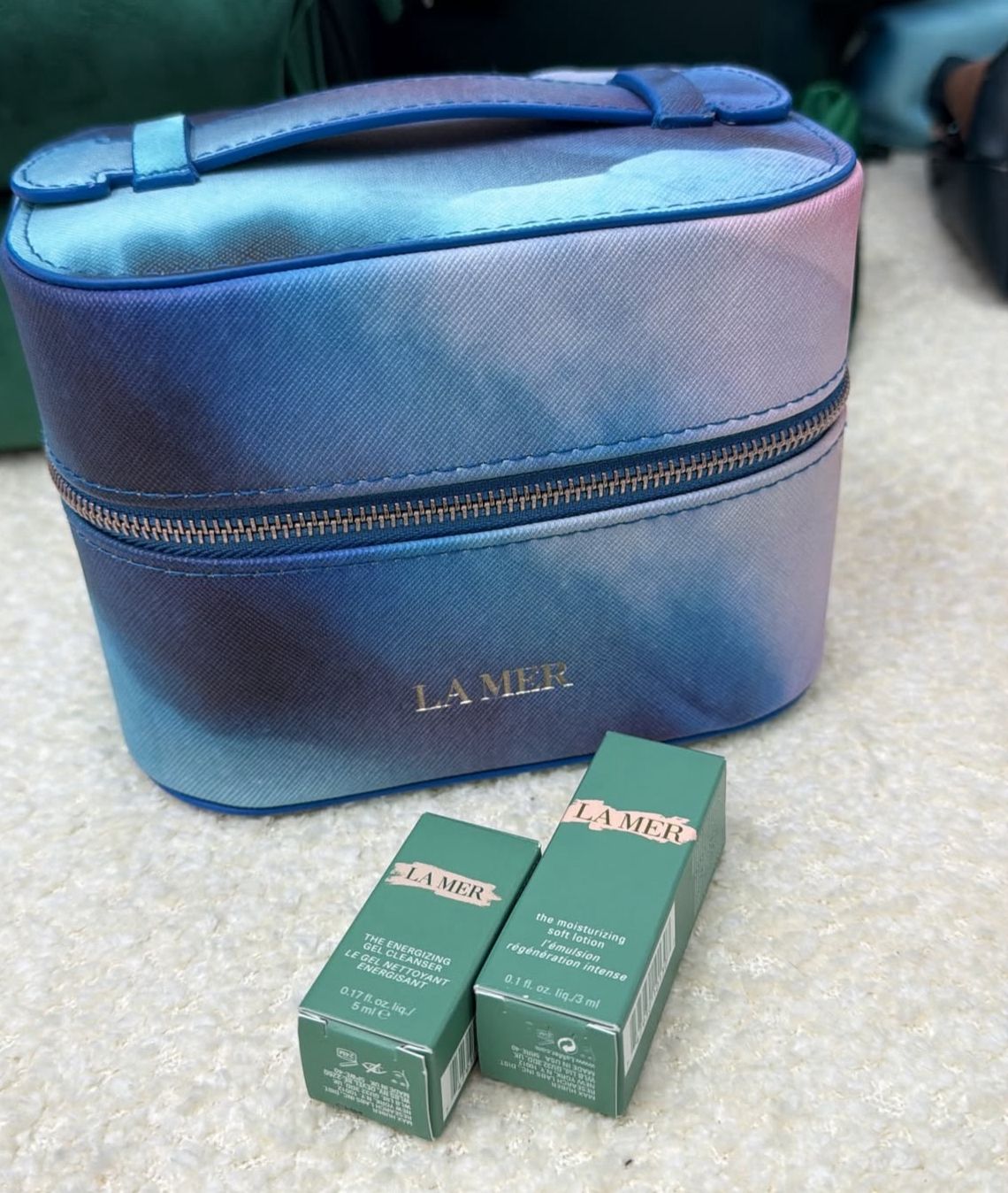 مجموعة عناية بالبشرة من علامة La Mer الفاخرة تأتي داخل حقيبة تجميل أنيقة بتصميم متدرج باللون الأزرق مع سحاب علوي ومقبض للحمل، مما يجعلها مثالية للسفر أو لحفظ مستحضرات العناية بالبشرة بطريقة مرتبة.