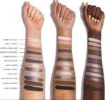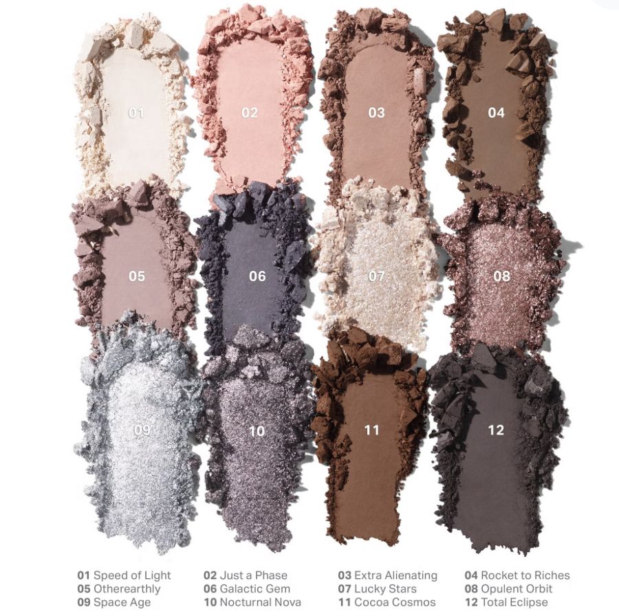 تحتوي اللوحة على مزيج متوازن من الألوان المطفية واللامعة والميتاليك، بدرجات تتراوح بين البيج الوردي، البني الدافئ، الرمادي، والفضي المتلألئ. تتميز بتركيبة ناعمة وسهلة الدمج، مما يساعد على توزيع اللون بسلاسة وثبات يدوم لساعات دون تكتل.