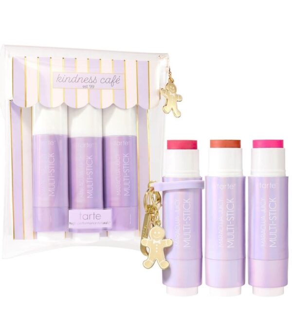 مجموعة Cheek Soufflé Maracuja Juicy Multi-Stick Trio من Tarte تضم ثلاثة أصابع متعددة الاستخدام بتركيبة كريمية غنية بخلاصة الماراكوجا، تمنح البشرة لوناً صحياً ولمعاناً طبيعياً.