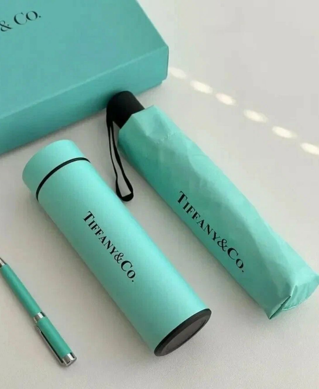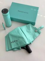 طقم عملي وأنيق بتصميم فاخر مستوحى من Tiffany & Co، يحتوي على مظلة أنيقة، قلم مميز، وعبوة حرارية مطابقة داخل علبة فخمة باللون الأزرق الكلاسيكي. خيار مثالي للاستخدام اليومي أو كهدية راقية تجمع بين الفخامة والعملية.