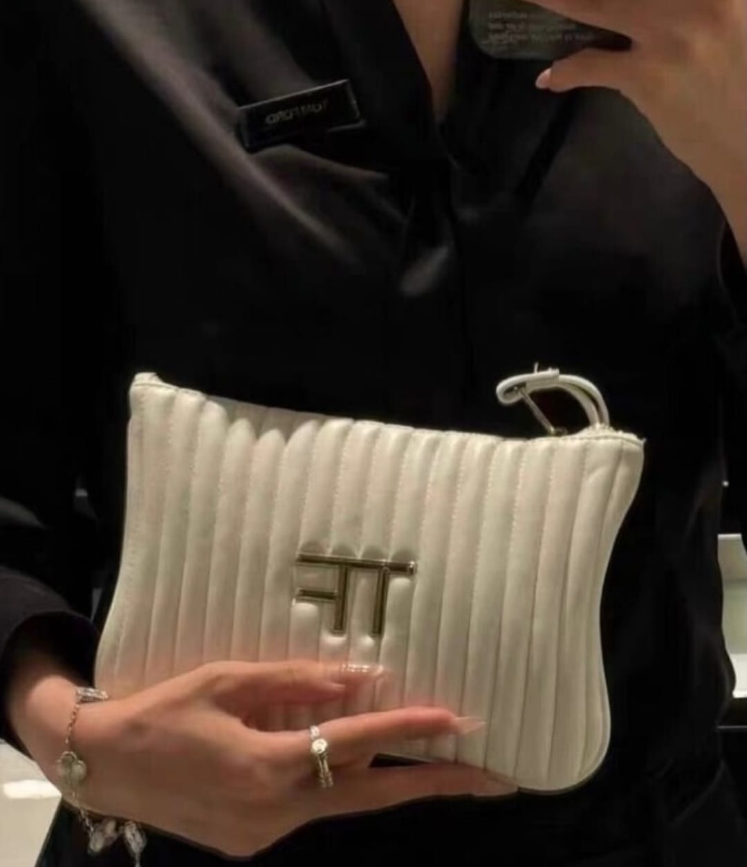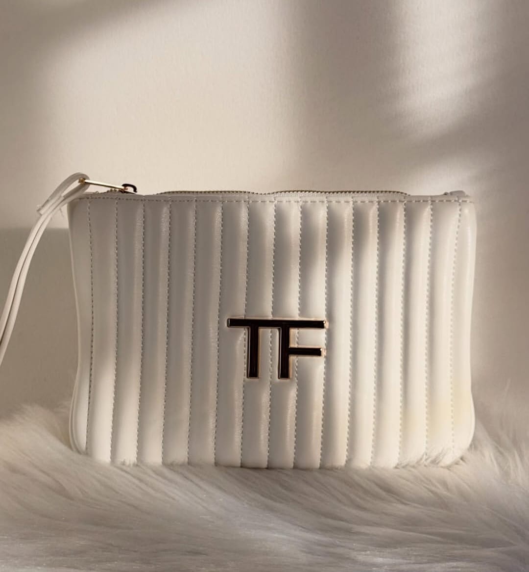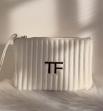 حقيبة يد أو حقيبة مستحضرات تجميل فاخرة من Tom Ford باللون الأبيض الكلاسيكي، مصممة بتبطين ناعم يمنحها مظهرًا أنيقًا وحماية مثالية للأغراض الداخلية. تتميز بجودة عالية وخامات فاخرة، مع تصميم عملي يتيح تنظيم مستحضرات التجميل أو الأغراض اليومية بطريقة مرتبة وراقية.