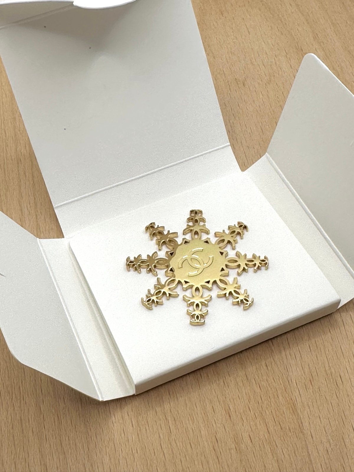 قطعة حصرية تعبّر عن فخامة شانيل وأناقتها الخالدة. بروش Snowflake بتصميم راقٍ مستوحى من أجواء الشتاء والاحتفالات، مصنوع من معدن ذهبي فاخر ويزيّنه شعار CC الأيقوني بدقة متناهية.